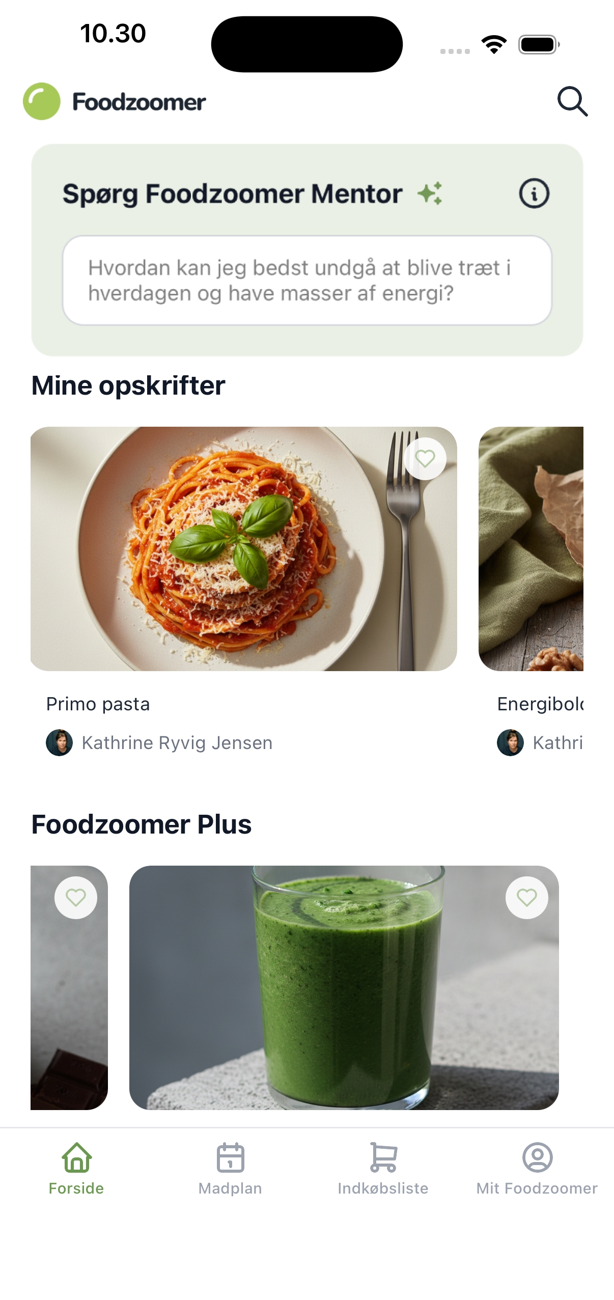 Gem opskrifter direkte i appen. Foodzoomer sørger for, at de automatisk bliver en del af din madplan - sorteret efter energi, næring og aktivitet/træning.